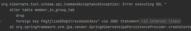 Caused by: java.sql.SQLSyntaxErrorException: Can't DROP 'FKg3 jlisb85 dp2 lrscoka2 e3 exv'; check that column/key exists 그래서 콘솔에도 있는지 확인하라는 문구가 뜹니다. 이것은 그래서 이렇게 해결!