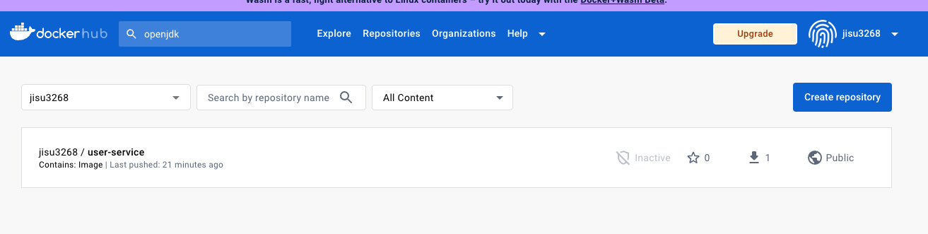 그러면 repository가 jisu3268/user-service , tag가 1.0으로 이미지가 생성됩니다.