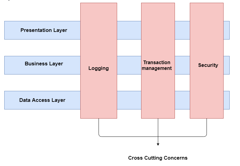 위 그림과 같이 각 레이어에서 반복 되는 기능들을 흩어진 관심사라고 부르며, 이렇게 흩어진 관심사들을 Aspect로 모듈화 하고 핵심적인 비즈니스 로직에서 분리하여 재사용하겠다는 것이 AOP 목적이라고 한다.