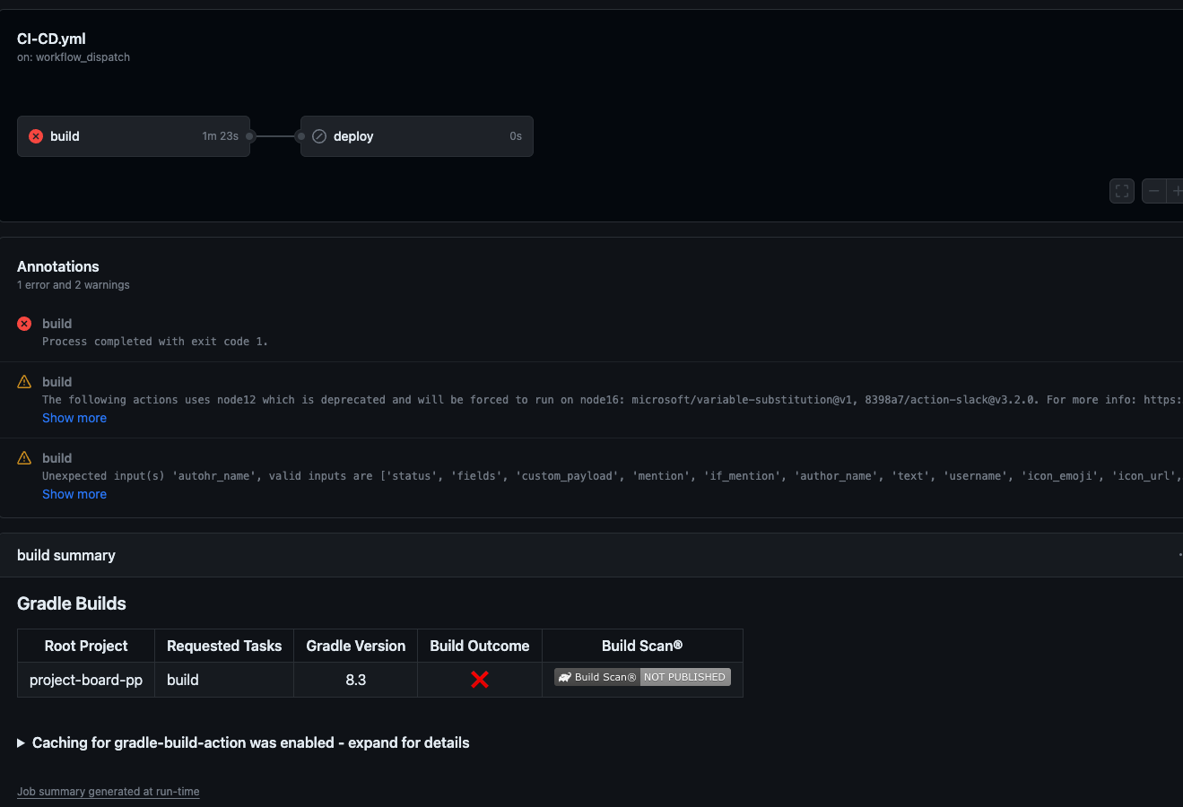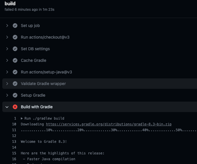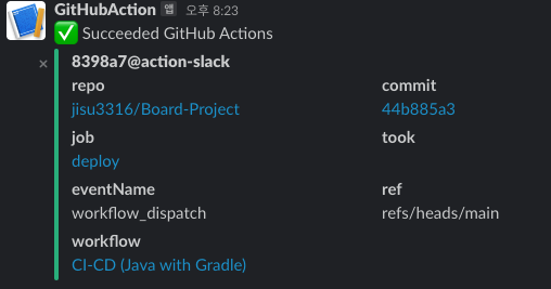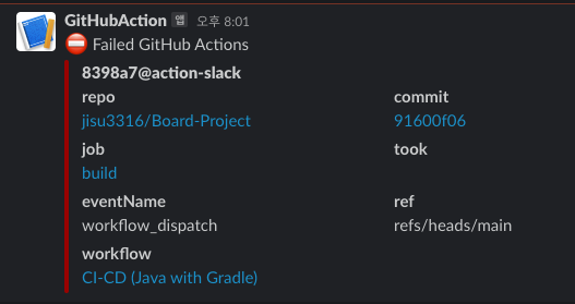 깃허브 액션 페이지에서 현재 어디서 실패했는지 확인할 수 있고 슬랙 알림 또한 잘 동작한다.