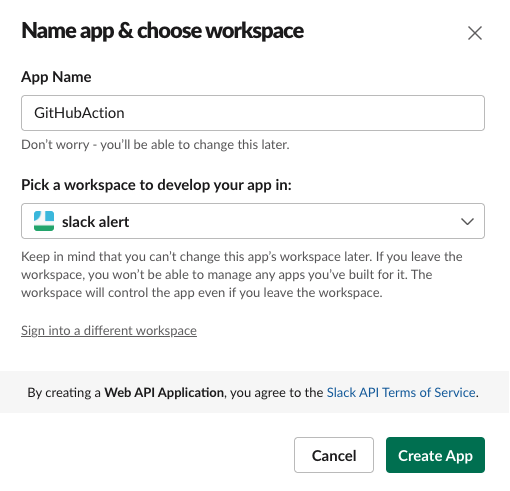3. App Name과 어떤 슬랙 워크스페이스에서 사용할지 선택한다.