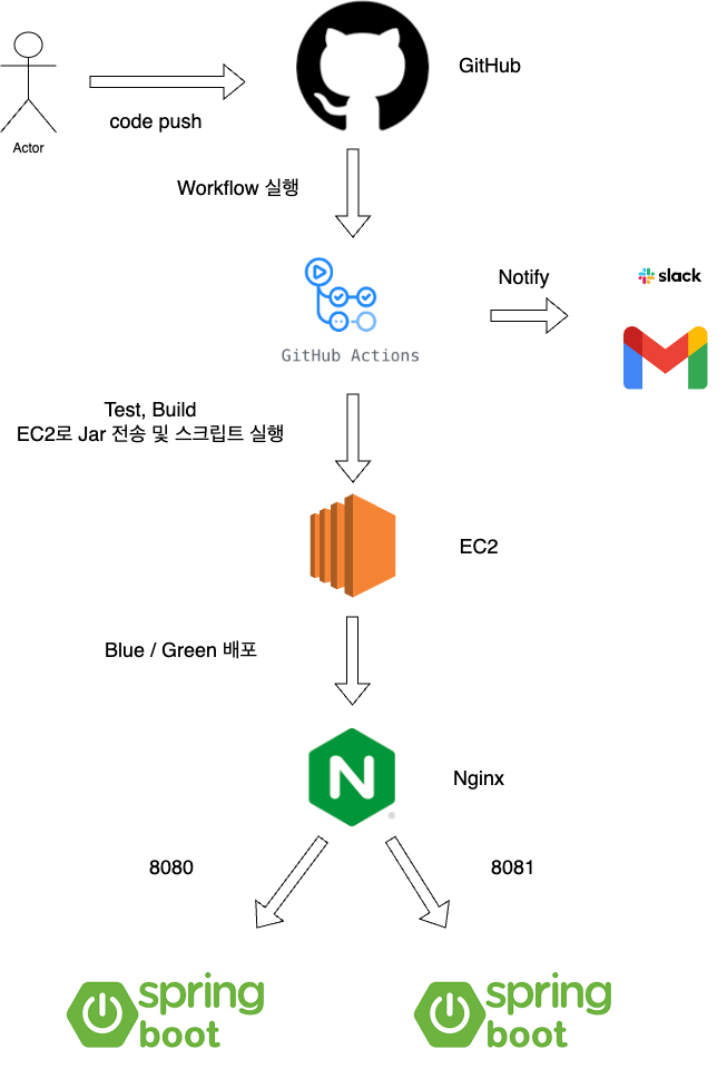 무중단 배포에는 여러 가지 방법이 있지만 Nginx를 사용해 Blue-Green 배포 전략을 선택하였습니다.