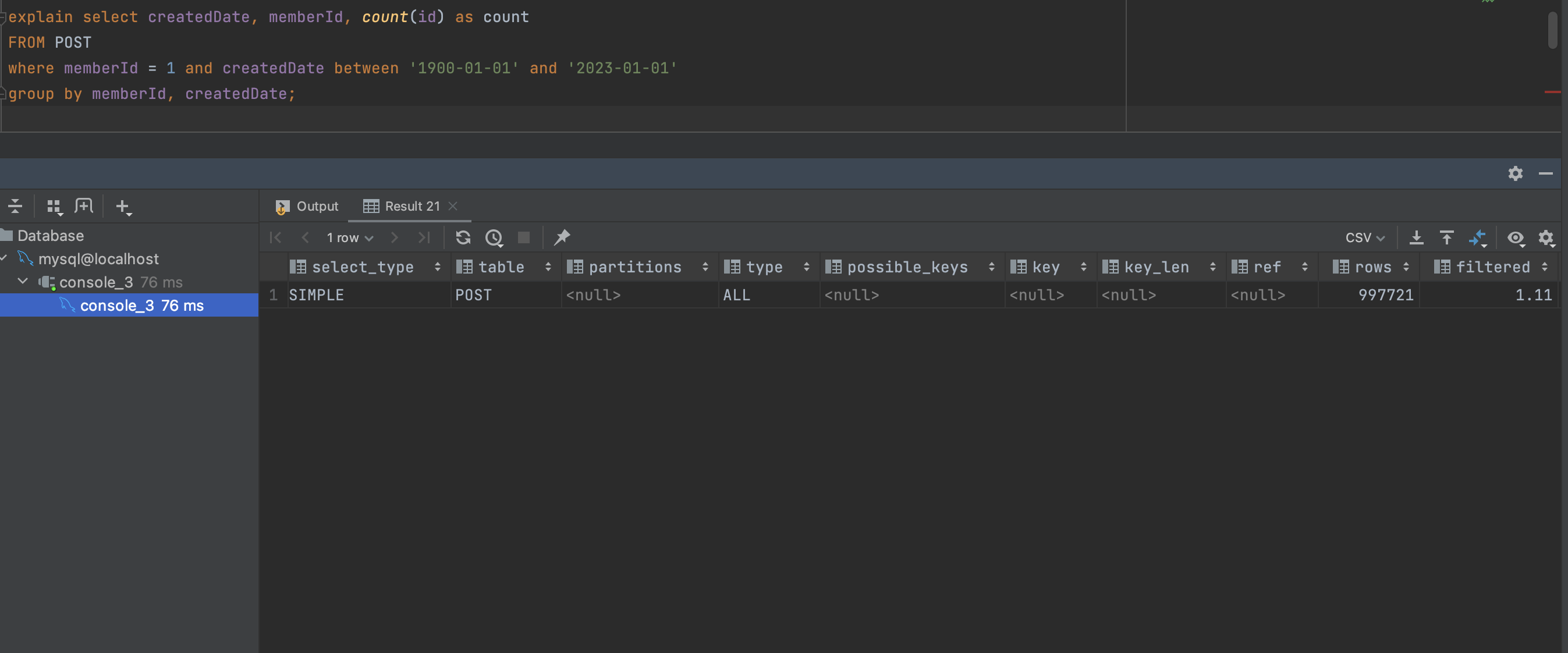 type ALL, rows 99만 건이 넘으므로 테이블의 모든 데이터를 읽은 것을 확인할 수 있습니다.
