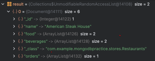 그래서 위의 restaurants 와 order를 lookup하면 다음과 사용할 수 있다.