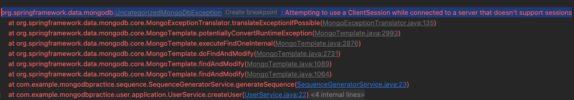 몽고 자바 서버에서 트랜잭션 어노테이션 붙은 메서드에서 몽고 디비 세션을 열려고 하니 지원이 안된다고 합니다.