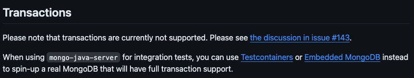 그래서 해당 mongo-java-server 깃허브에 들어가 보니 트랜잭션에 대해서 지원하지 않으니 테스트 컨테이너를 사용하거나 임베디드 몽고 디비를 사용하라고 안내해 줍니다...