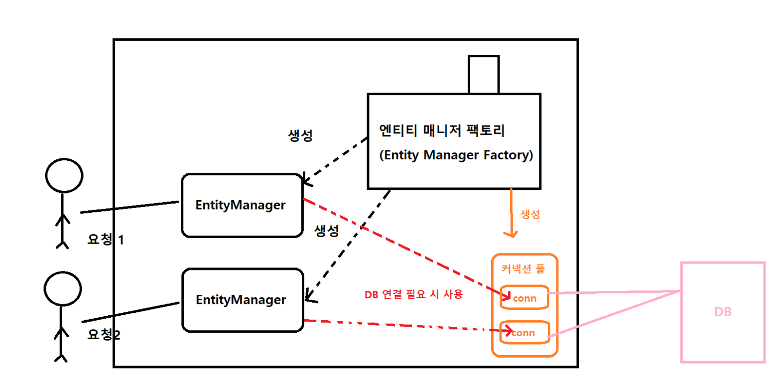 엔티티 매니저 팩토리는 생성되는 시점에 DB 커넥션 풀을 생성해 둔 후, 요청이 들어올 때마다 엔티티 매니저를 생성합니다. 엔티티 매니저는 DB 연결이 필요한 시점( 보통 트랜잭션이 시작되는 경우)에 connection을 얻습니다.