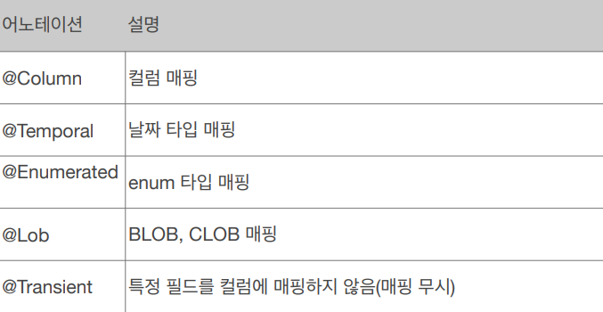 - precision,scale(DDL) : BigDecimal 타입에서 사용한다(BigInteger도 사용할 수 있다). precision은 소수점을 포함한 전체 자 릿수를, scale은 소수의 자릿수 다. 참고로 double, float 타입에는 적용되지 않는다. 아주 큰 숫자나 정 밀한 소수를 다루어야 할 때만 사용한다. (기본값 : precision=19, scale=2)