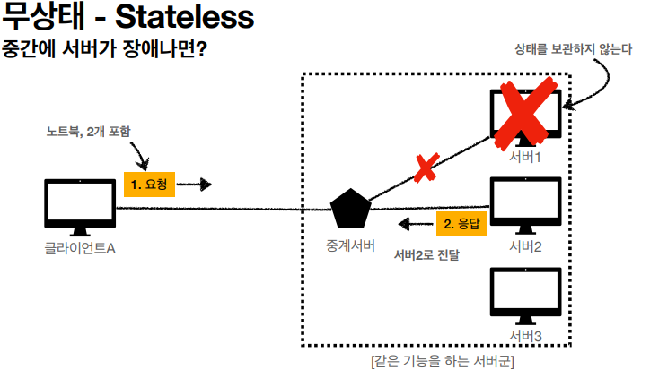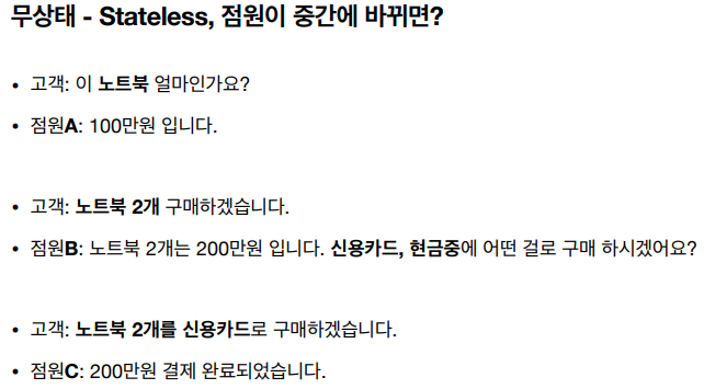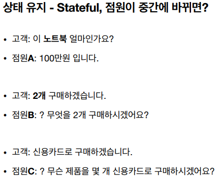 • 무상태: 중간에 다른 점원으로 바뀌어도 된다.