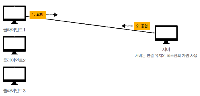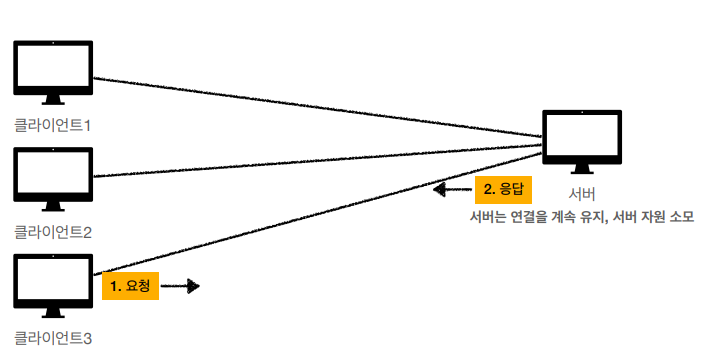 보통의 TCP/IP는 연결을 유지한다.연결을 유지하는 모델의 경우는 클라이언트1이 요청을보내고 응답을 보내면 연결이 됩니다. 그리고 클라이언트2,3도 마찬가지로 연결을 하면 연결된 상태가 유지되므로 서버자원이 소모가 됩니다.