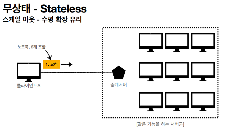 그래서 무상태는 수평확장에 유리합니다.예를 들어 이벤트 페이지를 할때 트래픽이 몰리면 서버를 갑자기 확 늘려버릴 수 있습니다.