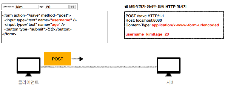 • form의 내용을 메시지 바디를 통해서 전송(key=value, 쿼리 파라미터 형식)