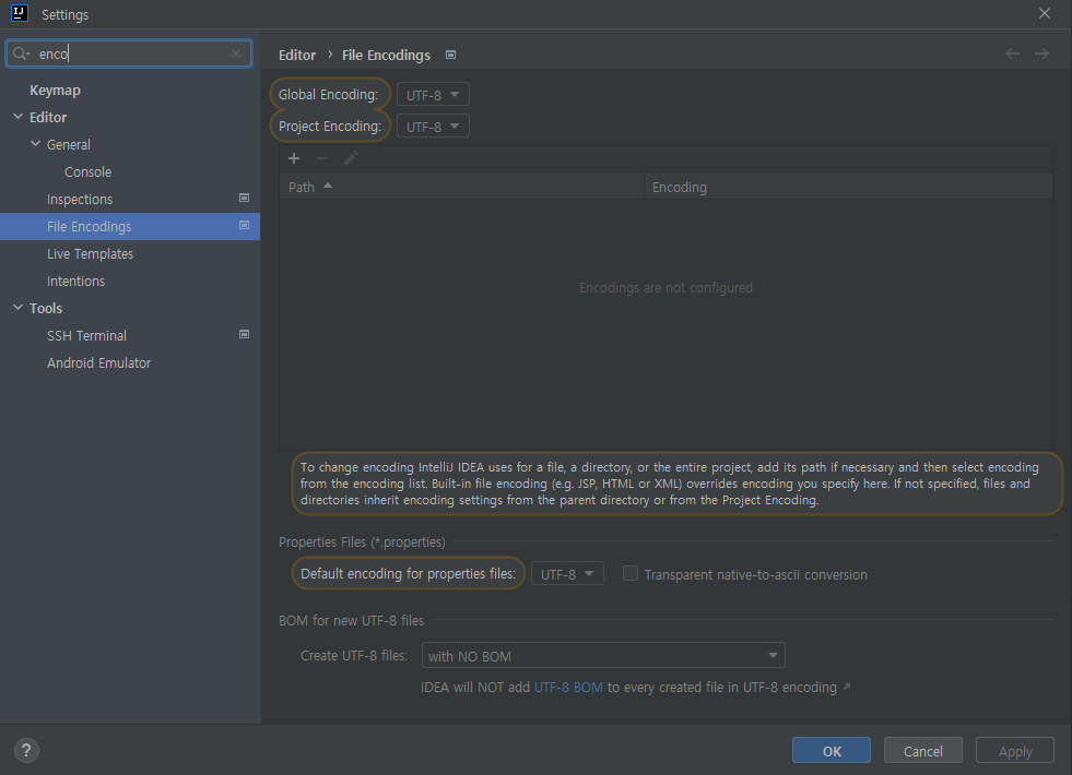 그럴때는 아래 경로로 들어가서 UTF-8 로 바꾸면 hello=안녕이라고 써놨던게 ??로 바뀌어져있다. 그러면 다시 안녕으로 바꾸고 테스트를 돌린다.