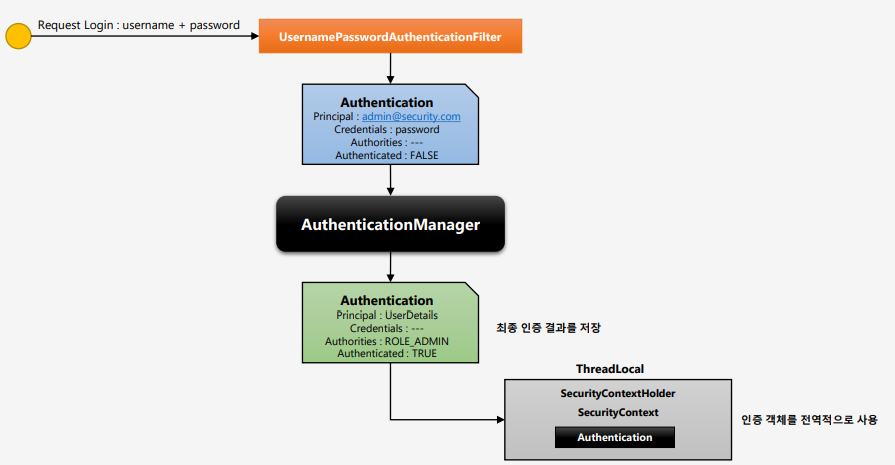 이 객체가 인증 검증을 위해 AuthenticationManager로 전달 됩니다.
