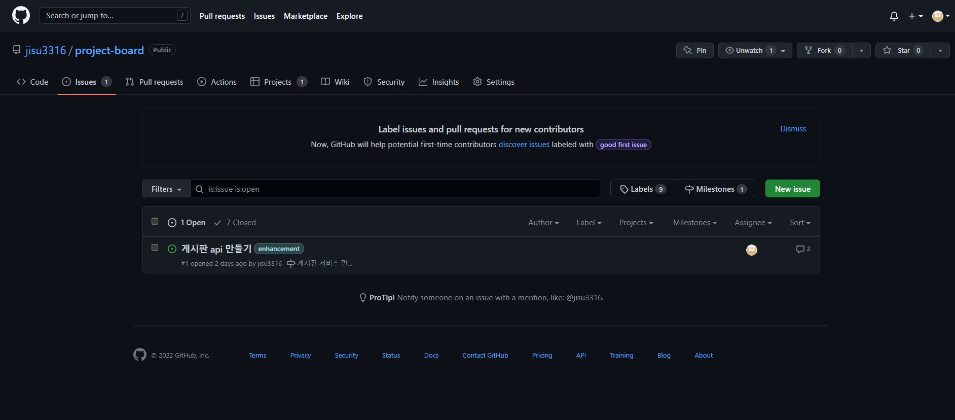 현재 오픈된 이슈와 닫힌 이슈를 볼 수 있다. 이렇게 현재 무엇을 하고 있고 무엇을 한 상태인지 쉽게 확인, 관리가 가능하다.