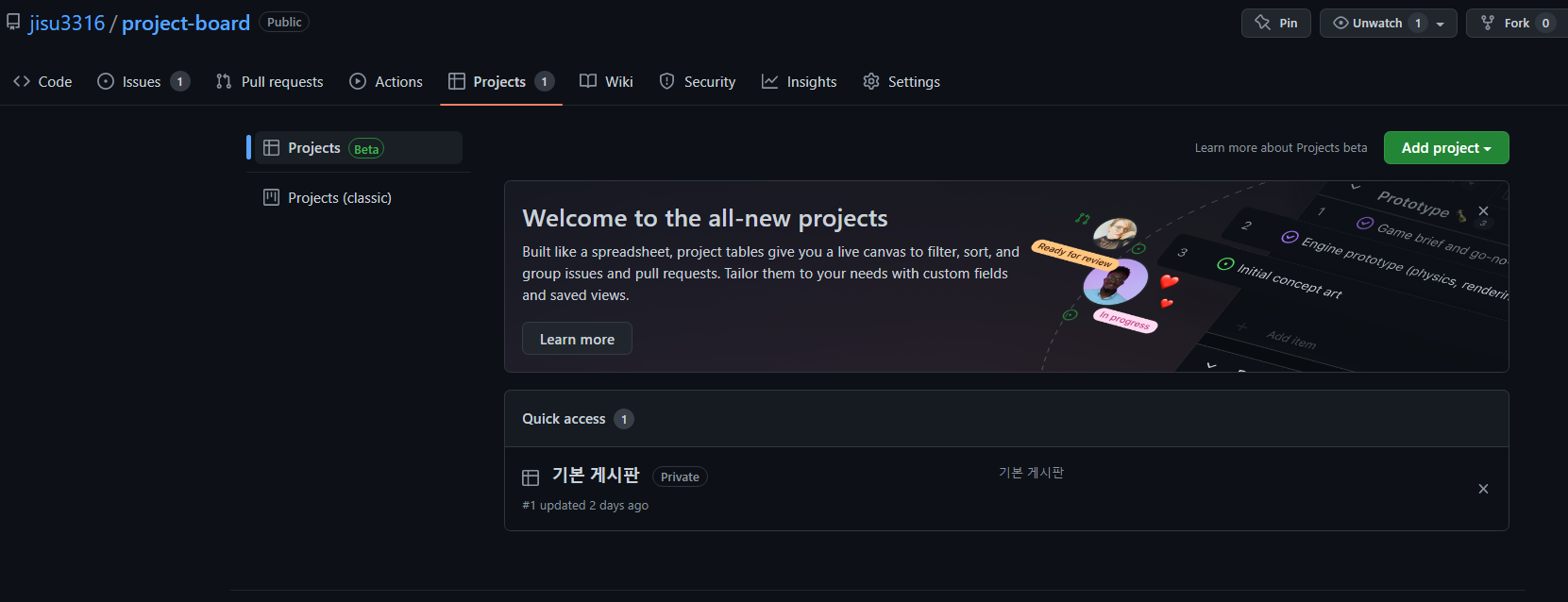 위 그림과 같이 Project칸이 있습니다..생전 처음 보는데 들어가면 칸반 보드로 잘 사용할 수 있게 되어있다.