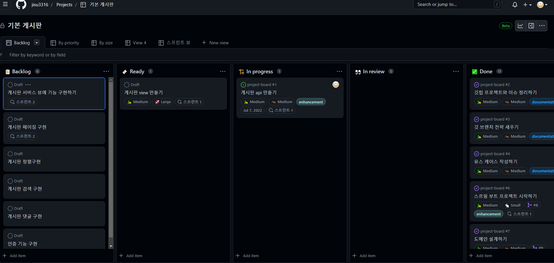 Ready에 다음 할 일 In progress 의 진행 중 In review는 현재 기능 개발을 하고 풀 리퀘스트 상태, Done은 이제 리뷰가 끝나면 최종 main브렌치에 머지가 된 상태이다.