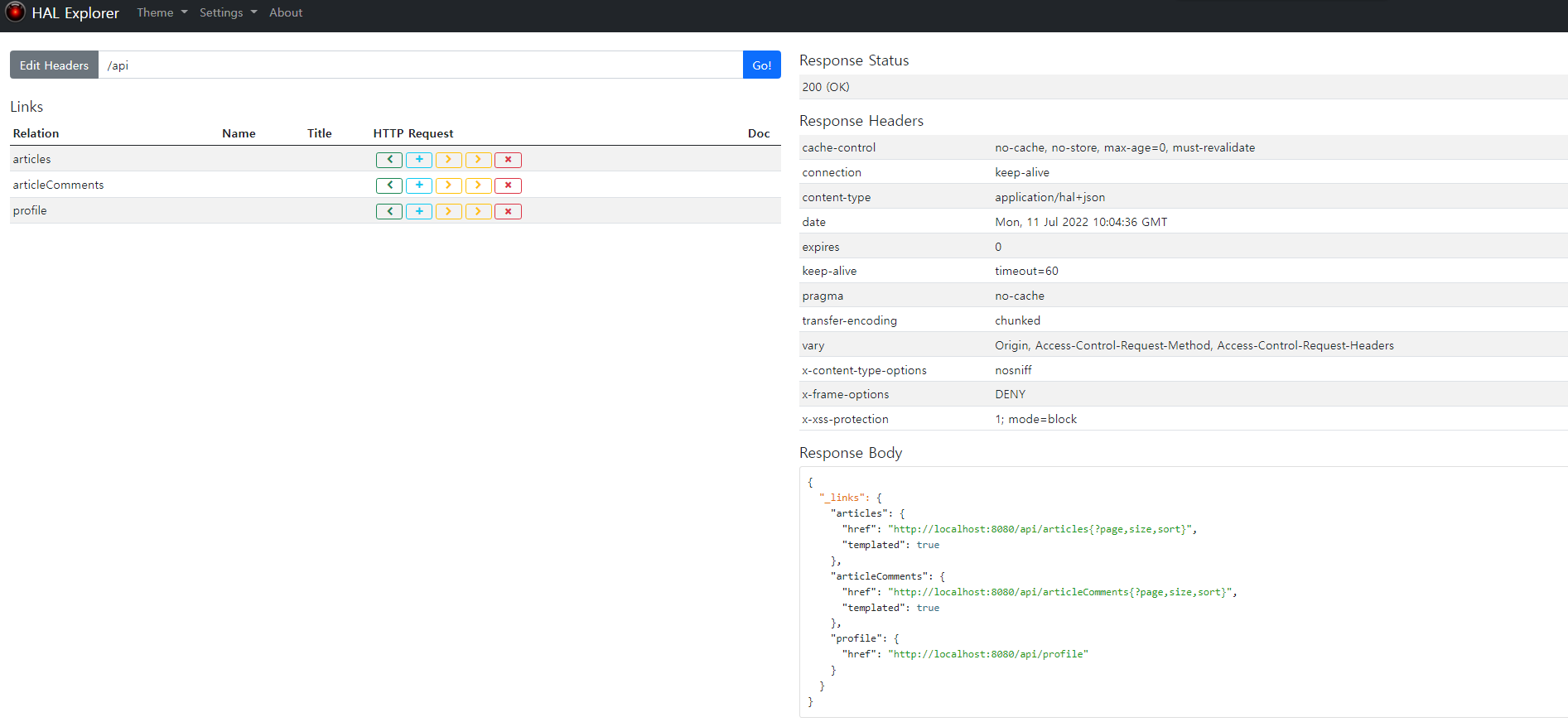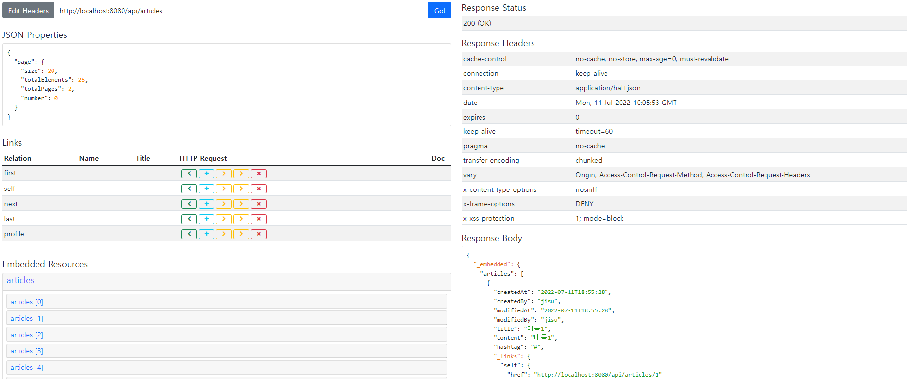 위와 같이 hal explorer가 켜집니다. 오른쪽에는 현재 생성된 REST API 이 보이고 있습니다. 이제 article을 요청해 봅시다.