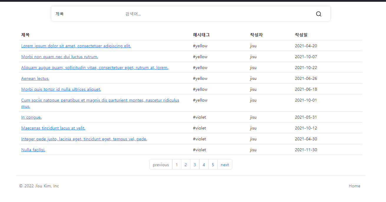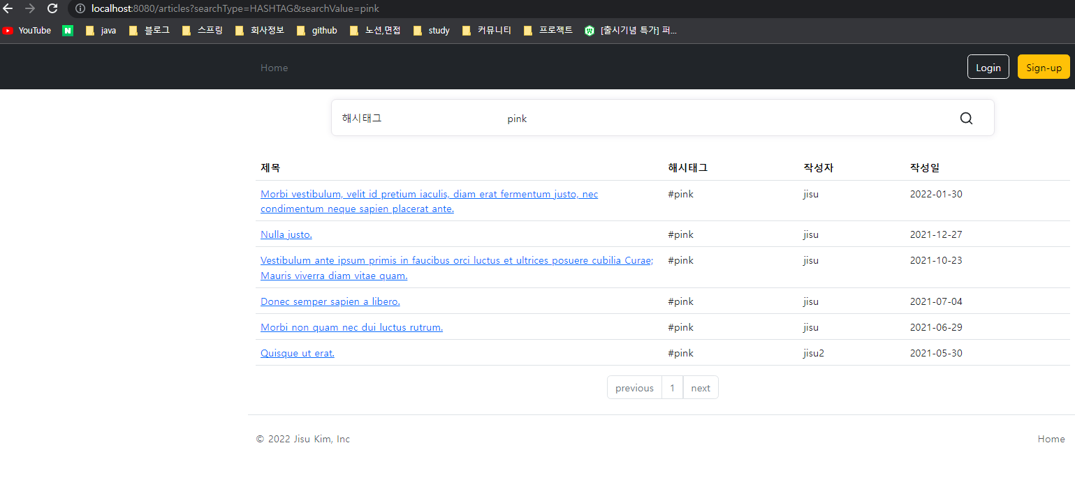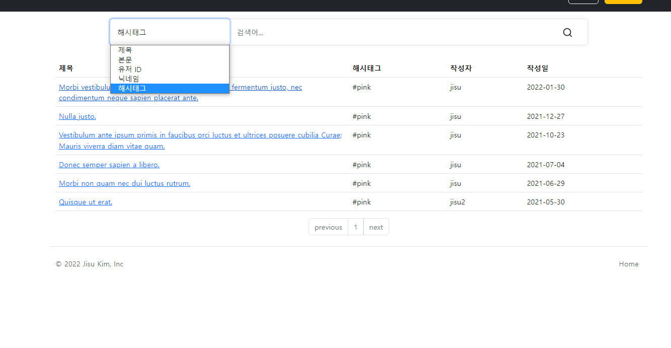 근데 여기서 저번글의 제목, 해시태그, 작성자, 작성일을 누르면 정렬이 되도록 구현했습니다. 현재 상태에서 해시태그를 누르거나 페이징 처리한 페이지를 누르면 searchtype과 searchValue를 넘겨주지 않고 있기때문에 검색을 안한 상태의 밑의 사진 처럼 나옵니다.