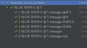 @CsvSource({"10, '자바 스터디'", "20, 스프링"})
