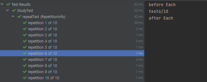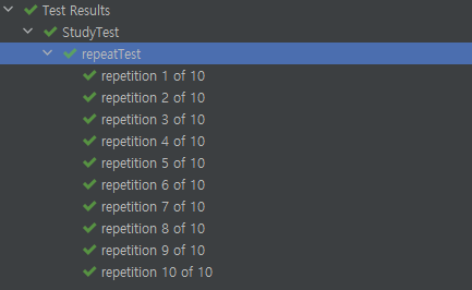 @RepeatedTest(10)을 하면 10번 테스트를 반복할 수 있다.