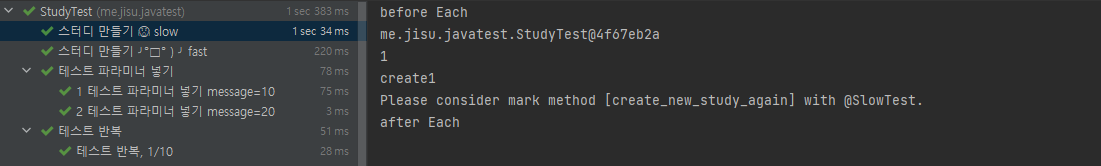 그리고 만약에 실행시간이 1초가 넘는다면 @SlowTest를 써달라는 메세지를 메소드이름과 함께 출력해줍니다.