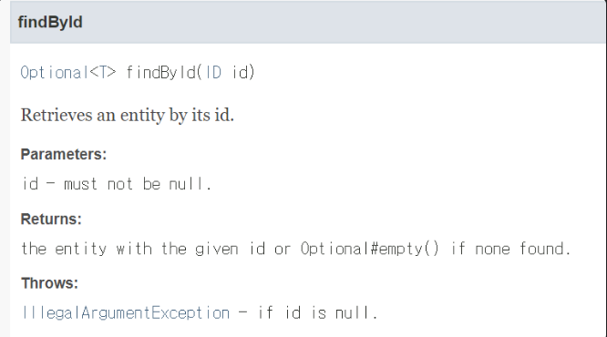 Optional<T> findById(ID id) : 탐색하다. 탐색 결과가 없을 수 있음. 내부 예외 발생 없음.