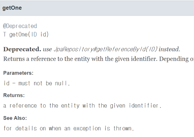 앞서 살펴본 T getOne(ID id) 메서드는 Deprecated 되었고,