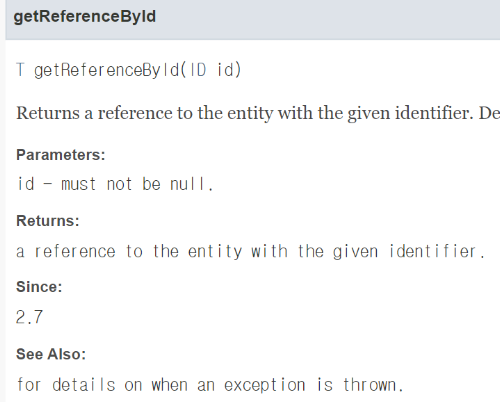 T getOne(ID id) : 가져오다. 가져오려는 대상이 없을 시, 내부에서 예외 발생. (EntityNotFoundException)