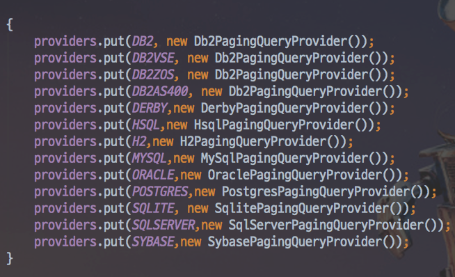 그래서 Spring Batch에서는 SqlPagingQueryProviderFactoryBean을 통해 Datasource 설정값을 보고 위 이미지에서 작성된 Provider 중 하나를 자동으로 선택하도록 합니다.